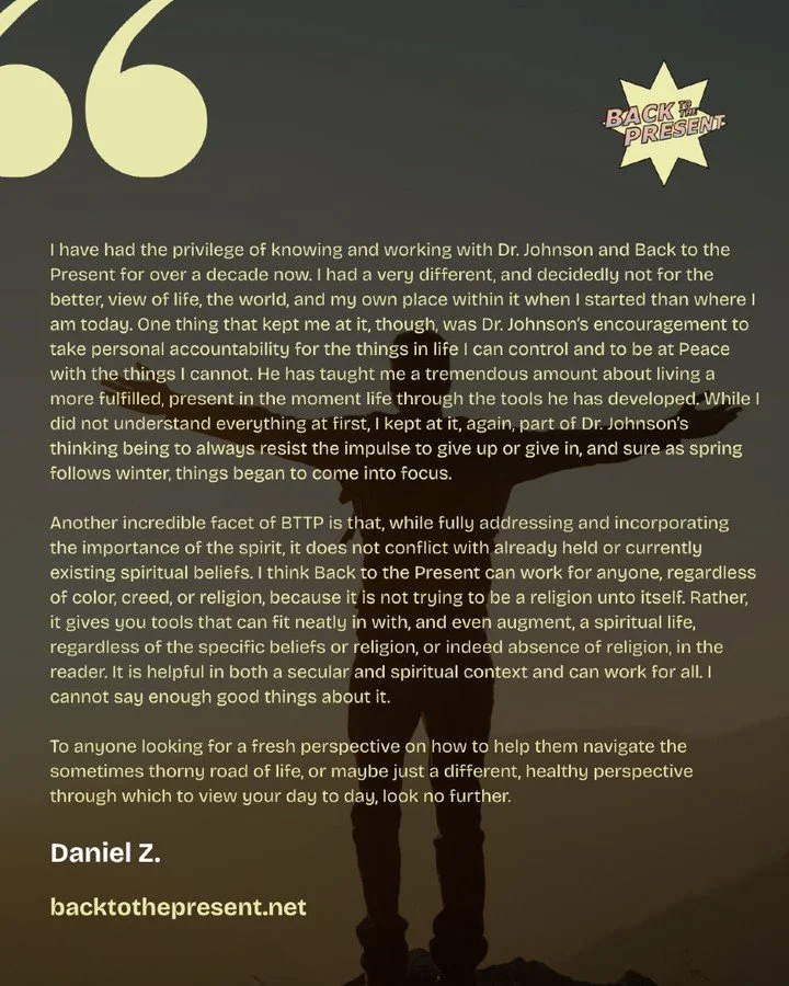 Dr Johnson's "Back to the Present" information and encouraging reads have inspired me in a lot of ways. My inspiration and desire to "do better" has now encouraged my husband to have the same inspiration and both of us have been sober from alcohol for awhile. Your guidance helped me realize some of