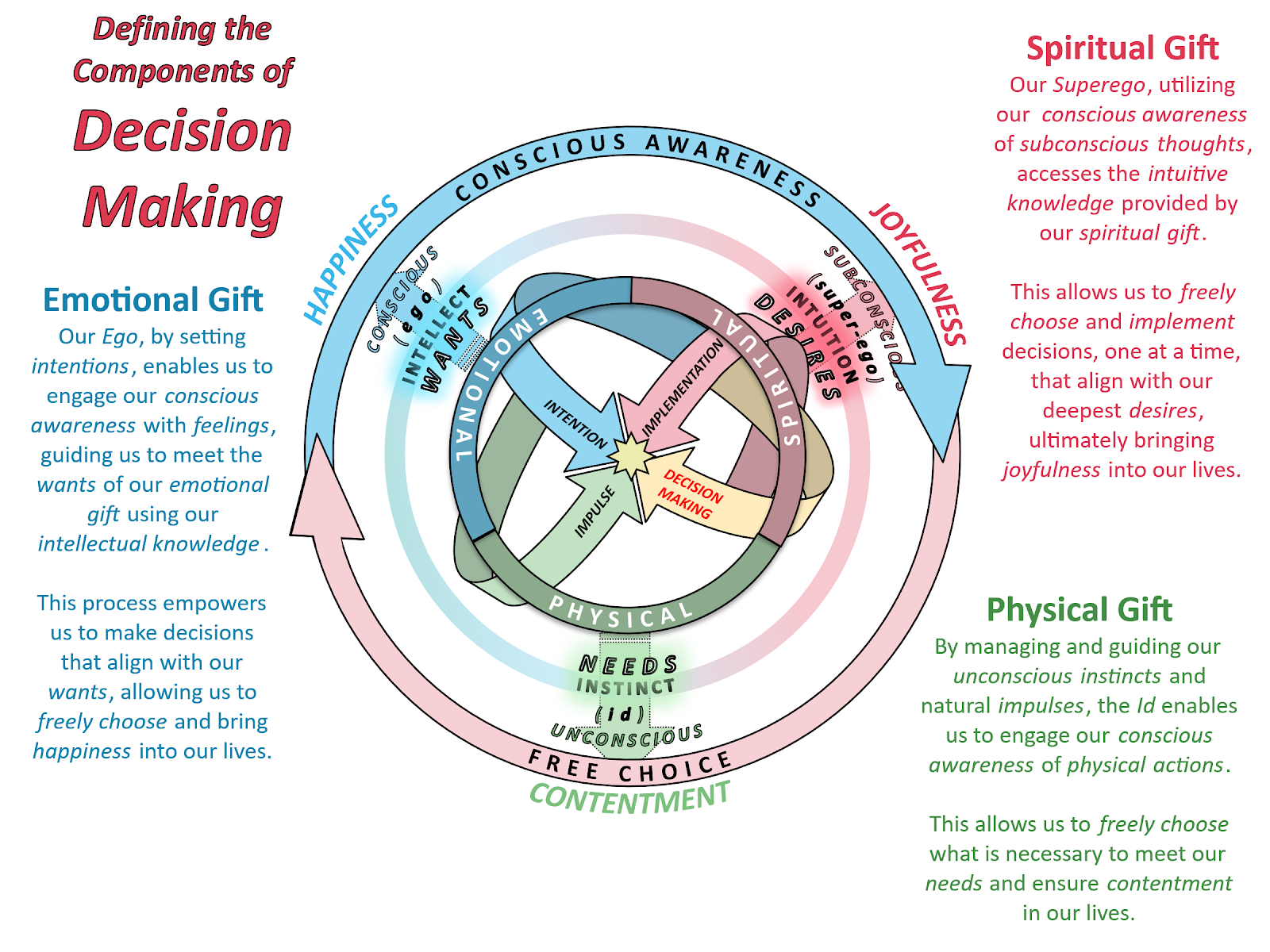 Ultimately, Decision-Making becomes a pathway toward higher consciousness—integrating id, ego, superego with the Creative Abilities and the Critical Understandings, showing how mindful, loving choices create a life rooted in presence, meaning, and joy.